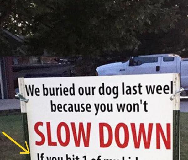 ”We buried our dog last week because you won’t slow down,” the sign read. “If you hit 1 of my kids your family may be burying you.”