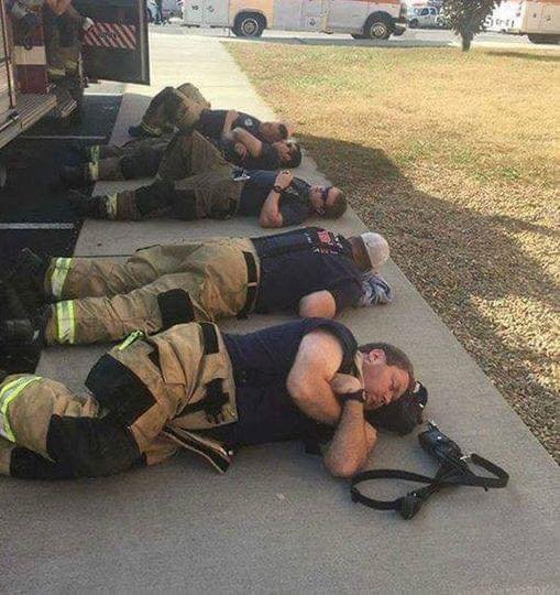 The image in question depicted a cluster of firefighters resting on a grassy area, completely drained of energy to the point where they simply collapsed in place to catch some sleep.