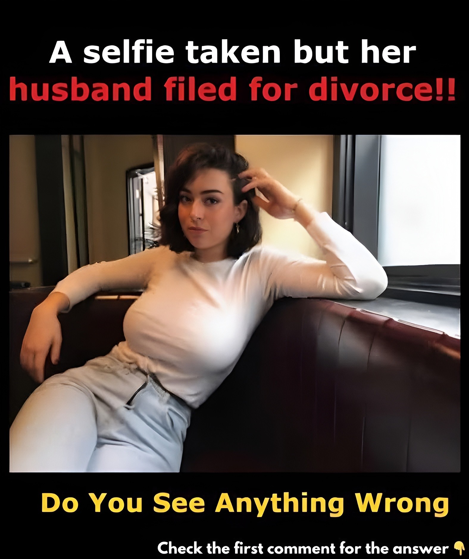 At first glance, most people won’t notice anything unusual in the image. The woman, having just gotten married, sends a picture to her husband. Sitting on her sofa, she casts a direct gaze at the camera, with sunlight filtering in through the window behind her. Despite her beauty, something immediately feels wrong to her husband.