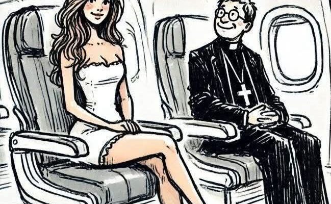 After some moments of conversation, the woman leaned slightly closer, her voice lowering to a whisper that only the priest could hear. “Father,” she said softly, her voice barely audible over the hum of the airplane engines, “would you mind helping me with something a bit… delicate?” Her words hung in the air, pregnant with meaning. She looked away briefly, as if gathering her composure, before glancing back across the aisle with a mix of vulnerability and resolve.