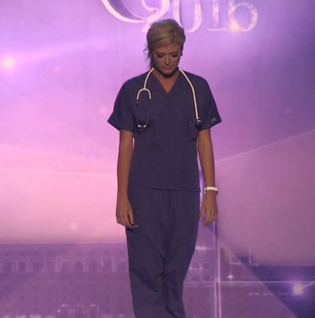 Kelley Johnson, representing Miss Colorado, emerged as the silent star of the night, not just for her poise or her appearance but for the powerful story she shared that resonated with everyone present. Dressed in simple nursing scrubs, she took the stage with quiet confidence, but what she brought forth was anything but simple. Kelley shared her experience caring for an elderly patient suffering from Alzheimer’s—a reminder about the silent battles many people face. Her story was touching, genuine, and filled with emotional depth, and it captivated the audience from start to finish.